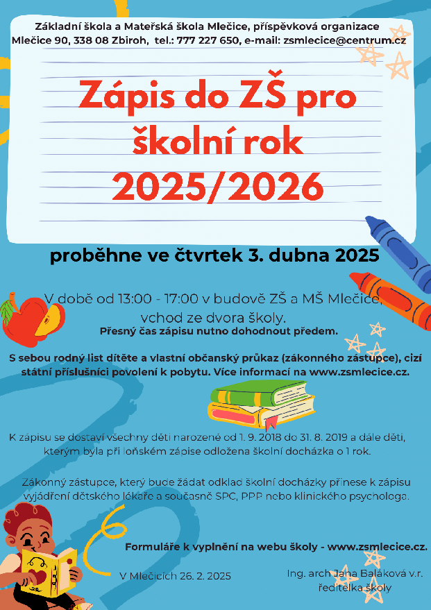Zápis do Základní školy v Mlečicích pro školní rok 2025/2026
